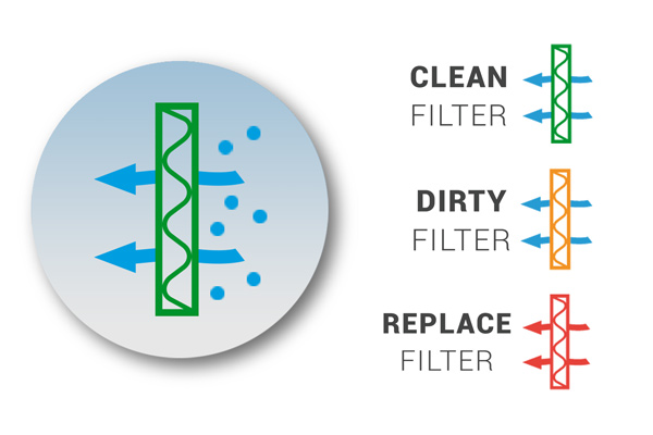 FilteralarmZeigt an, wann der Filter gereinigt oder ersetzt werden muss. Das Filtersignal wechselt seine Farbe abhängig von dem Filterzustand und zusammen mit einer Warnmeldung auf dem Bedienteil